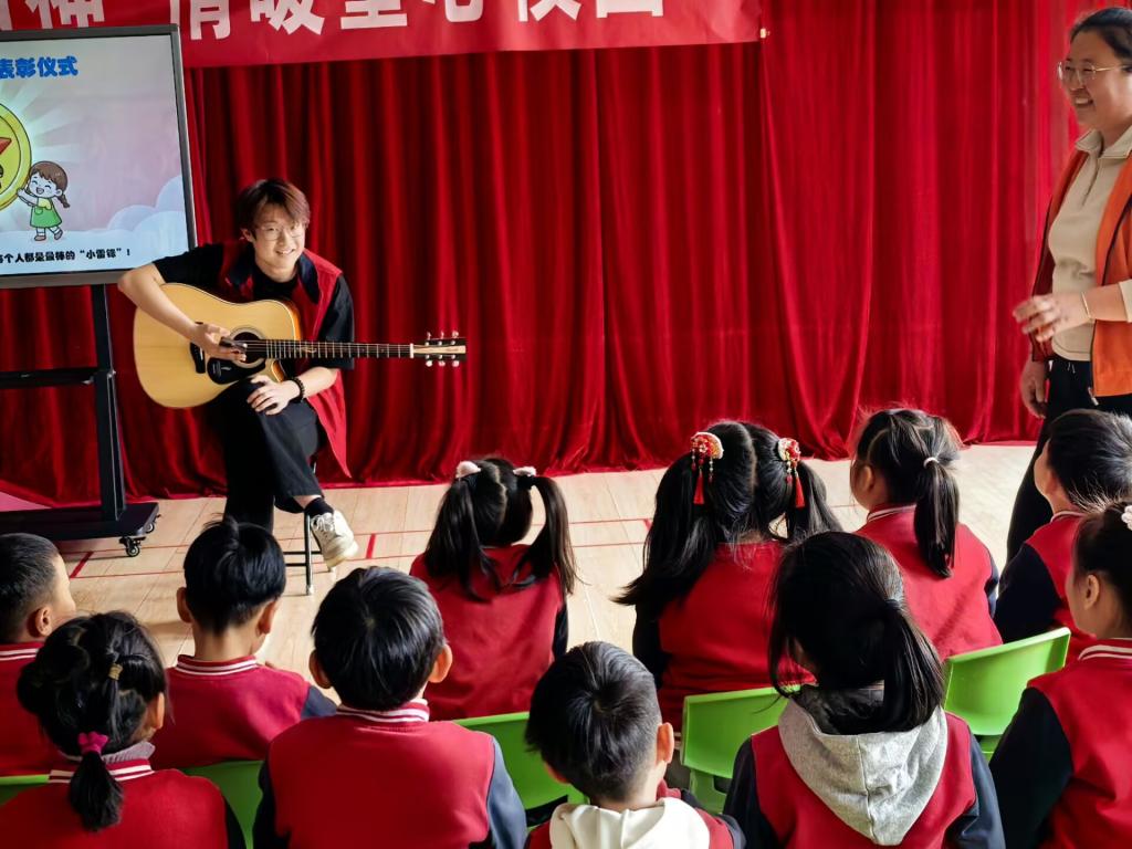 为了让活动更具趣味性,宣讲过程中还穿插了吉他弹唱表演,志愿者用轻快治愈的旋律、温柔的歌声活跃现场气氛,把“奉献、友爱”的理念融入歌声里,让孩子们在倾听与跟唱中,直观感受“帮助他人,快乐自己”的快乐,现场不时响起孩子们稚嫩的掌声与笑声。